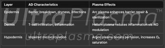 Atopic Dermatitis is a chronic, inflammatory skin disorder marked by epidermal barrier dysfunction, immune dysregulation, and altered dermal microbiome. UltraPlasma™ multi-platform plasma therapy system, offers a novel, non-invasive approach by utilizing arc, argon, and helium plasmas to restore barrier integrity, reduce microbial burden, and modulate inflammatory responses. This article discusses the biochemical, immunological, and physiological effects of UltraPlasma™ treatment on the skin layers and associated gas dynamics including ozone (O₃), nitric oxide (NO), and oxygen (O₂) micro-environments.