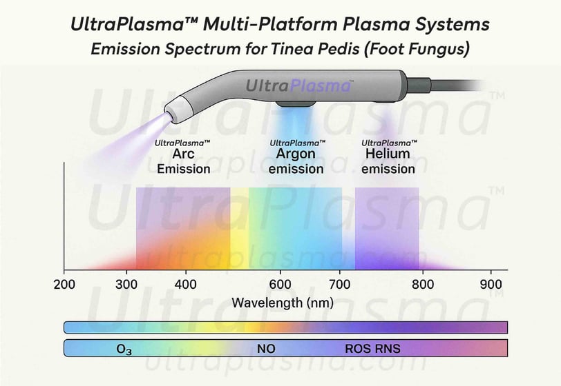 Tinea pedis is caused predominantly by Trichophyton rubrum and Trichophyton interdigitale, thriving in warm, moist conditions. Traditional treatments include topical and oral antifungal agents, but recurrences and drug resistance are common. Plasma medicine has emerged as a non-thermal, drug-free modality leveraging ionized gases to disrupt microbial life cycles while promoting tissue repair. UltraPlasma™ integrates multiple plasma outputs to tailor energy, gas composition, and depth of action.