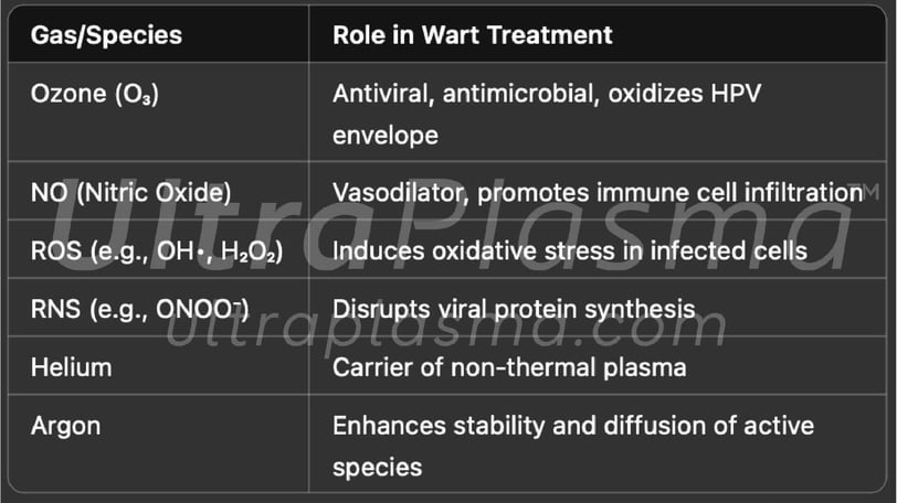 Their treatment requires both viral clearance and local tissue regeneration. UltraPlasma™, an advanced system that integrates arc, argon, and helium plasma technologies with a custom software and hardware-controlled output spectrum, introduces a novel multi-gas plasma therapeutic strategy tailored for effective wart removal, immunological modulation, and dermal regeneration.